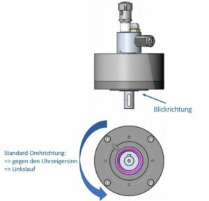 Bei der PTM ATEX Rührwerkstechnik handelt es sich bei allen Motoren, Antrieben und Komplettrührwerken standardmäßig um Linksläufer, also mit Drehrichtung gegen den Uhrzeigersinn. Auf Anfrage kann die Drehrichtung in Rechtslauf geändert werden.