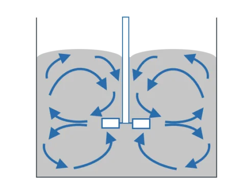 Radial fördernde Rührorgane bewegen das Mischgut Richtung Behälterwand. Dort teilt sich das Mischgut in zwei Richtungen, also nach oben und nach unten, auf. Der Strom wird dann jeweils vom Boden und der Oberfläche nach innen abgelenkt und erreicht wieder die Rotationsachse mit Rührwelle und Rührorgan.
