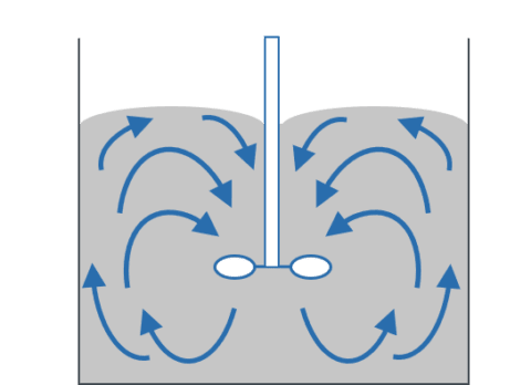 Axial fördernde Rührorgane bewegen das Mischgut zuerst Richtung Boden von wo aus es in Richtung der Behälterwand nach außen, entlang der Wand nach oben an die Oberfläche und anschließend wieder nach innen Richtung Rührwelle und Rührorgan befördert wird.