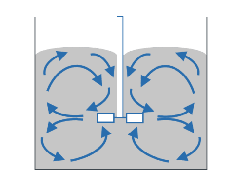 Radial fördernde Rührorgane bewegen das Mischgut Richtung Behälterwand. Dort teilt sich das Mischgut in zwei Richtungen, also nach oben und nach unten, auf. Der Strom wird dann jeweils vom Boden und der Oberfläche nach innen abgelenkt und erreicht wieder die Rotationsachse mit Rührwelle und Rührorgan.
