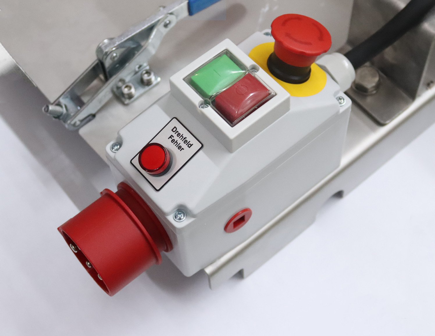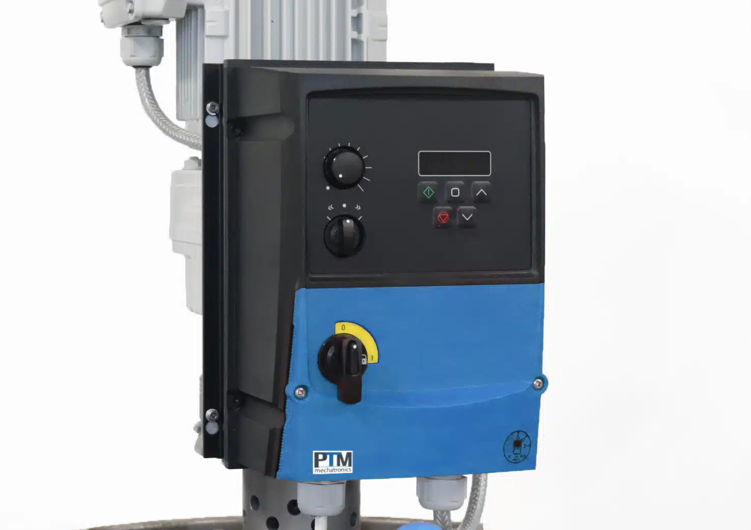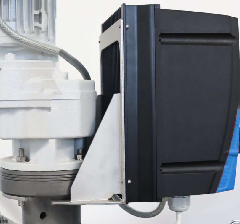 Frequenzumrichter mit integriertem Motorschutzschalter, Display, Not-Aus und 3 m Kabel – vormontiert mit Montagewinkel zur sicheren Ansteuerung elektrischer Antriebe.