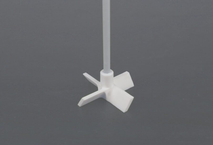 Der PTFE-Propeller erzeugt durch seine spezielle Blattgeometrie eine axiale Strömung, die für eine gleichmäßige Verteilung von Flüssigkeiten und Feststoffen sorgt. Durch die geringe Reibung und die Antihaft-Eigenschaften bleibt das Material sauber und reduziert Ablagerungen im Rührprozess.